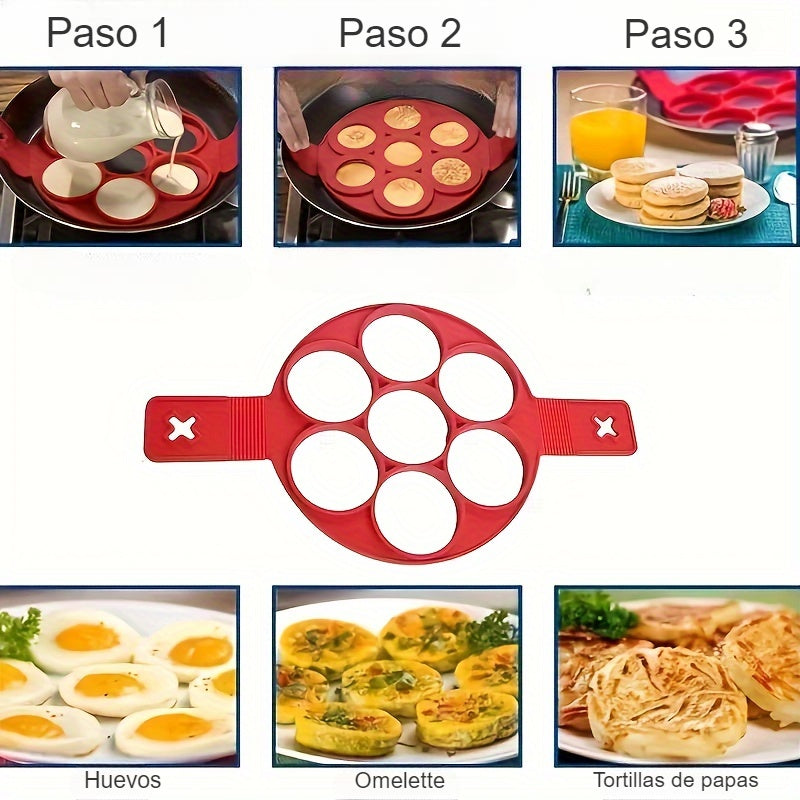 Este molde de silicona es una excelente opción tanto para cocineros aficionados como para profesionales, ya que combina practicidad, seguridad y eficiencia. Gracias a su material antiadherente, evita que los alimentos se peguen, facilitando tanto la cocción como la limpieza. Al contar con 7 espacios circulares, permite preparar porciones uniformes en menos tiempo, ideal para familias, desayunos en grupo o cocinas con alta demanda. Además, su resistencia al calor y su diseño flexible lo hacen fácil de manipular, almacenar y reutilizar, convirtiéndolo en una alternativa duradera, económica y ecológica frente a otros métodos tradicionales. Considerar para su uso un sarten de 25cms de diámetro
